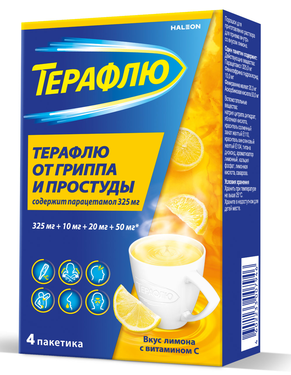 1 пакетик содержит: действующие вещества: парацетамол 325 мг, фенилэфрина гидрохлорид 10 мг, фенирамина малеат 20 мг, аскорбиновая кислота 50 мг. вспомогательные вещества: натрия цитрата дигидрат, яблочная кислота, краситель солнечный закат желтый, краситель хинолиновый желтый, титана диоксид, ароматизатор лимонный, кальция фосфат трехосновный, лимонная кислота, сахароза.