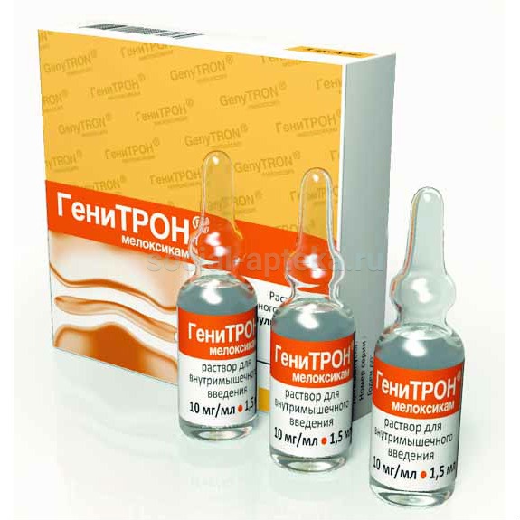 Применение препарата противопоказано во время беременности.  Известно, что НПВП проникают в грудное молоко, поэтому применение препарата в период грудного вскармливания противопоказано.  Как препарат ингибирующий синтез ЦОГ/простагландина, Генитрон® может оказывать влияние на фертильность, поэтому не рекомендуется женщинам, планирующим беременность. Мелоксикам может приводить к задержке овуляции. В связи с этим у женщин, имеющих проблемы с зачатием и проходящим обследование по поводу подобных проблем, рекомендуется отмена приема препарата Генитрон®. Т.к. потенциальный риск побочных реакций зависит от дозы и продолжительности лечения следует использовать минимально эффективную дозу минимально возможным коротким курсом.  Продолжительность курса лечения устанавливают индивидуально в зависимости от течения заболевания и эффективности проводимой терапии.  Пациенты с желудочно-кишечными заболеваниями, при применении препарата Генитрон® должны регулярно проходить обследование. Не следует назначать препарат пациентам с пептической язвой или желудочно-кишечным кровотечением. В любое время в процессе лечения при наличии или без предыдущих симптомов, серьезных желудочно-кишечных заболеваний в анамнезе, могут появиться потенциально фатальные желудочно-кишечные кровотечения, язва или перфорация. При возникновении язвенного поражения ЖКТ или желудочно-кишечного кровотечения препарат необходимо отменить. Наиболее серьезные последствия наблюдали у людей пожилого возраста.  У пациентов с сердечно-сосудистыми заболеваниями или с факторами риска развития таких заболеваний НПВП могут увеличивать риск появления серьезных сердечно-сосудистых тромботических явлений, инфаркта миокарда, приступа стенокардии и инсульта, которые могут быть фатальными.  При увеличении продолжительности лечения этот риск может возрастать.  НПВП могут усилить задержку натрия, калия и воды и снижать натрийуретические эффекты диуретиков. Как следствие, у предрасположенных пациентов может возникать или усиливаться сердечная недостаточность или артериальная гипертензия. Таким пациентам рекомендуется проведение клинического мониторинга, а также у них должна поддерживаться адекватная гидратация.  До начала лечения необходимо исследование функции почек. В случае проведения комбинированной терапии следует также контролировать функции почек.  У пациентов со сниженным почечным кровотоком применение НПВП (НПВП ингибируют синтез почечного простагландина, что играет важную роль в поддержании почечного кровотока) может послужить причиной почечной недостаточности, проходящей при прекращении противовоспалительной терапии нестероидными средствами.  Наибольший риск такой реакции имеет место у пациентов пожилого возраста, с дегидратацией, с хронической сердечной недостаточностью, циррозом печени, нефротическим синдромом, хроническими заболеваниями почек, которые получают сопутствующую терапию диуретическими препаратами, ингибиторами АПФ или антагонистами рецепторов ангиотензина II, или после обширных хирургических вмешательств, которые привели к гиповолемии. Таким пациентам необходим контроль диуреза и функции почек в начале терапии. В единичных случаях НПВП могут привести к интерстициальному нефриту, гломерулонефриту, ре
