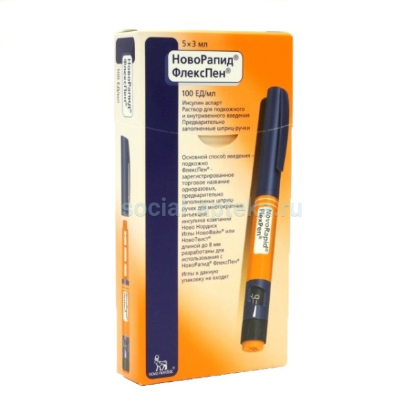 НовоРапид ФлексПен - гипогликемическое.ФармакодинамикаИнсулин аспарт — аналог человеческого инсулина короткого действия, произведенный методом биотехнологии рекомбинантной ДНК с использованием штамма Saccharomyces cerevisiae, в котором аминокислота пролин в положении В28 замещена на аспарагиновую кислоту.Взаимодействует со специфическим рецептором внешней цитоплазматической мембраны клеток и образует инсулинрецепторный комплекс, стимулирующий внутриклеточные процессы, в т.ч.синтез ряда ключевых ферментов (включая гексокиназу, пируваткиназу, гликогенсинтетазу). Снижение содержания глюкозы в крови обусловлено повышением ее внутриклеточного транспорта, усилением усвоения тканями, стимуляцией липогенеза, гликогеногенеза, снижением скорости продукции глюкозы печенью.Замещение аминокислоты пролин в положении В28 на аспарагиновую кислоту в инсулине аспарт снижает тенденцию молекул к образованию гексамеров, которая наблюдается в растворе обычного инсулина. В связи с этим инсулин аспарт гораздо быстрее всасывается из подкожно-жировой клетчатки и начинает действовать гораздо быстрее, чем растворимый человеческий инсулин. Инсулин аспарт сильнее снижает уровень глюкозы в крови в первые 4 ч после приема пищи, чем растворимый человеческий инсулин.Продолжительность действия инсулина аспарт после п/к введения короче, чем растворимого человеческого инсулина.После п/к введения действие препарата начинается в течение 10–20 мин после введения. Максимальный эффект наблюдается через 1–3 ч после инъекции. Продолжительность действия препарата составляет 3–5 ч.Клинические исследования с участием пациентов с сахарным диабетом типа 1 продемонстрировали снижение риска ночной гипогликемии при использовании инсулина аспарт по сравнению с растворимым человеческим инсулином. Риск дневной гипогликемии достоверно не повышался.Инсулин аспарт является эквипотенциальным растворимому человеческому инсулину на основании показателей молярности.Взрослые. Клинические исследования с участием пациентов с сахарным диабетом типа 1 демонстрируют более низкую постпрандиальную концентрацию глюкозы крови при введении инсулина аспарт по сравнению с растворимым человеческим инсулином.Пожилые. Было проведено рандомизированное двойное слепое перекрестное исследование фармакокинетики и фармакодинамики (ФК/ФД) инсулина аспарт и растворимого человеческого инсулина у пожилых больных сахарным диабетом типа 2 (19 больных в возрасте 65–83 лет, средний возраст 70 лет). Относительные отличия фармакодинамических свойств между инсулином аспарт и растворимым человеческим инсулином у пожилых пациентов были схожи с таковыми у здоровых добровольцев и у более молодых больных сахарным диабетом.Дети и подростки. Применение инсулина аспарт у детей показало схожие результаты длительного гликемического контроля при сравнении с растворимым человеческим инсулином.Клиническое исследование с использованием растворимого человеческого инсулина до приема пищи и инсулина аспарт после приема пищи было проведено у маленьких детей (26 пациентов в возрасте от 2 до 6 лет); а также фармакокинетическое/фармакодинамическое (ФК/ФД) исследование с использованием однократной дозы было проведено у детей (6–12 лет) и подростков (13–17 лет). Фармакодинамический профиль инсулина а