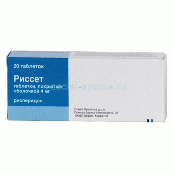 Риссет - антипсихотическое средство (нейролептик), производное бензизоксазола; оказывает также седативное, противорвотное и гипотермическое действие. Селективный моноаминергический антагонист, обладает высокой тропностью к серотонинергическим 5-НТ2 и дофаминергическим D2-рецепторам, связывается также с α1-адренорецепторами и с несколько меньшей аффинностью — с Н1-гистаминергическими и α2-адренергическими рецепторами. Не обладает тропностью к холинорецепторам.Антипсихотическое действие обусловлено блокадой дофаминовых D2-рецепторов мезолимбической и мезокортикальной системы. Седативное действие обусловлено блокадой адренорецепторов ретикулярной формации ствола головного мозга; противорвотное действие — блокадой дофаминовых D2-рецепторов триггерной зоны рвотного центра; гипотермическое действие — блокадой дофаминовых рецепторов гипоталамуса.Подавляет продуктивную симптоматику (бред, галлюцинации, агрессивность), автоматизм. Вызывает меньшее подавление моторной активности и в меньшей степени индуцирует каталепсию, чем классические антипсихотические средства — АПС (нейролептики). Сбалансированный центральный антагонизм к серотонину и дофамину может уменьшать склонность к экстрапирамидным побочным действиям и расширять терапевтическое воздействие препарата с охватом негативных и аффективных симптомов шизофрении. Может индуцировать зависящее от дозы увеличение концентрации пролактина в плазме.ФармакокинетикаАбсорбция — быстрая и полная (пища не влияет на полноту и скорость абсорбции). Абсолютная биодоступность — 74%; относительная (таблетки по сравнению с раствором) — 94%. Tmax в плазме рисперидона — 1 ч; 9-гидроксирисперидона — 3 ч (при высокой активности изоферментаCYP2D6) и 17 ч (при низкой активности изофермента CYP2D6).Css рисперидона в организме у большинства пациентов достигается в течение 1 дня, а 9-гидроксирисперидона — 4–5 дней. Концентрации рисперидона и 9-гидроксирисперидона в плазме пропорциональны дозе препарата (в пределах 1–16 мг/сут). Быстро распределяется по организму, проникает в ЦНС, грудное молоко. Vd — 1–2 л/кг. Связь с белками плазмы (с α1-кислый гликопротеин и альбумины) рисперидона — 90%, 9-гидроксирисперидона — 77%.Метаболизируется изоферментом CYP2D6 до активного метаболита 9-гидроксирисперидона (рисперидон и 9-гидроксирисперидон составляют активную антипсихотическую фракцию). Другим путем метаболизма является N-дезалкилирование.T1/2 рисперидона — 3 ч (при высокой активности изофермента CYP2D6) и 20 ч (при низкой активности изофермента CYP2D6), T1/2 9-гидроксирисперидона — 21 ч (при высокой активности изофермента CYP2D6) и 30 ч (при низкой активности изофермента CYP2D6); активной антипсихотической фракции — 20 ч.Выводится почками 70% (35–45% в виде фармакологически активной антипсихотической фракции) и с желчью (14%).При хронической почечной недостаточности (ХПН) клиренс креатинина снижается на 60%.При печеночной недостаточности содержание рисперидона в плазме повышается на 35%.У пожилых пациентов снижается клиренс и удлиняется T1/2.