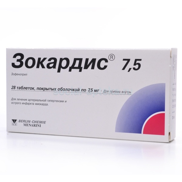 ФармакодинамикаИнгибитор АПФ, антигипертензивный препарат. Механизм действия связан с уменьшением образования ангиотензина II из ангиотензина I. Снижение содержания ангиотензина II ведет к прямому уменьшению выделения альдостерона, при этом снижается ОПСС, систолическое и диастолическое АД, пост- и преднагрузка на миокард. Расширяет артерии в большей степени, чем вены, при этом рефлекторного повышения ЧСС не отмечается. Уменьшает деградацию брадикинина, увеличивает синтез простагландина.Гипотензивный эффект более выражен при высокой концентрации ренина плазмы крови, чем при нормальной или сниженной его концентрации. Снижение АД в терапевтическом диапазоне не влияет на мозговое кровообращение, кровоток в сосудах мозга поддерживается на достаточном уровне и на фоне сниженного АД. Усиливает коронарный и почечный кровоток.При длительном применении уменьшается гипертрофия левого желудочка миокарда и миоцитов стенок артерий резистивного типа, предотвращает прогрессирование сердечной недостаточности и замедляет развитие дилатации левого желудочка. Улучшает кровоснабжение ишемизированного миокарда. Снижает агрегацию тромбоцитов. Зофеноприл является пролекарством, т.к. активностью обладает свободное сульфгидрильное соединение (зофеноприлат), образующееся в результате тиоэфирного гидролиза.После приема внутрь гипотензивный эффект развивается через 1 ч, достигает максимума через 4-6 ч и сохраняется до 24 ч. В некоторых случаях для достижения оптимального снижения АД необходима терапия на протяжении нескольких недель. При сердечной недостаточности заметный клинический эффект наблюдается при длительном лечении (6 мес и более).ФармакокинетикаВсасывание и распределениеПосле приема внутрь зофеноприл кальция быстро и полностью абсорбируется из ЖКТ и подвергается почти полному превращению в зофеноприлат.Cmax зофеноприлата в плазме крови достигается через 1,5 ч после приема Зокардиса. Связывание с белками плазмы крови для зофеноприла составляет 88%.Метаболизм и выведениеЗофеноприл быстро метаболизируется в печени с образованием активного метаболита зофеноприлата. T1/2 зофеноприлата составляет 5,5 ч, общий клиренс составляет 1300 мл/мин. Выводится зофеноприлат преимущественно почками - 69%, через кишечник - 26%.