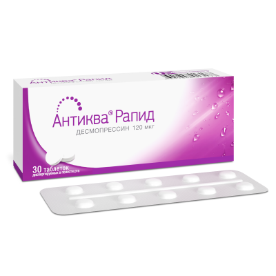 Обязательным является ограничение до минимума приема жидкости за 1 час до приема и в течение 8 часов после приема препарата у пациентов при первичном ночном энурезе и ноктурии. Несоблюдение правил приема препарата может стать причиной задержки жидкости в организме и/или гипонатриемии, которые могут проявляться следующими симптомами: головная боль, головокружение, тошнота, рвота, увеличение массы тела, в тяжелых случаях – отек мозга, судороги и кома. Безопасность препарата при длительном приеме в случаях ночного энуреза не исследовалась. Пациентов необходимо тщательно проинструктировать о необходимости соблюдения режима потребления жидкости. Следует предупредить пациента о необходимости избегать перегрузки жидкостью и прекратить прием десмопрессина на фоне рвоты и диареи, до тех пор, пока не восстановится водный баланс. Перед началом лечения следует убедиться в согласии пациента ограничивать потребление жидкости. Риск гипонатриемических судорог, вызванных гипонатриемией, может быть сведен к минимуму при условии применения рекомендованной начальной дозы десмопрессина и исключения сопутствующего применения препаратов, повышающих секрецию антидиуретического гормона. Для диагностики ночной полиурии у пациентов с ноктурией за 2 дня до начала лечения необходимо следить за частотой и объемом мочевыведения. Увеличение мочеобразования в ночное время, превышающее емкость мочевого пузыря или превышающее 1/3 часть суточного объема мочи, рассматривается как ночная полиурия. При приеме десмопрессина для лечения ночного энуреза наблюдались случаи отека мозга и судорог у здоровых детей и подростков. На основании доступной информации можно сделать заключение, что наиболее высок риск развития отека мозга и судорог в первую неделю приема препарата. Наиболее часто гипонатриемия возникает у пациентов пожилого возраста (старше 65 лет) с несахарным диабетом с исходно низкой концентрацией натрия в плазме крови и полиурией 2,8-3 л в сутки. Препарат Антиква® Рапид применяют у них с особой осторожностью. При применении препарата в этих случаях необходимо определять концентрацию натрия в плазме крови до начала приема препарата, через 3 дня после начала приема и при каждом увеличении дозы. Необходимо контролировать состояние пациента в течение всего периода приема препарата Антиква® Рапид. Препарат Антиква® Рапид необходимо применять с осторожностью у пациентов с хронической почечной недостаточностью, фиброзом мочевого пузыря, муковисцидозом, ишемической болезнью сердца, артериальной гипертензией, с потенциальным риском повышения внутричерепного давления; нарушением водно-электролитного баланса; у пациентов с риском развития тромбозов; при беременности, в том числе при преэклампсии; у пациентов пожилого возраста (старше 65 лет) при применении для лечения несахарного диабета. У пациентов с артериальной гипертензией или хроническим заболеванием почек возможно развитие симптомов, указанных в разделе «Побочное действие». Особую осторожность следует проявлять при применении препарата Антиква® Рапид у детей и пожилых пациентов, или пациентов с риском повышения внутричерепного давления, стараясь предотвратить задержку жидкости в организме. Пациенты и, при применении препарата у детей, их родители должны быть проинформиро
