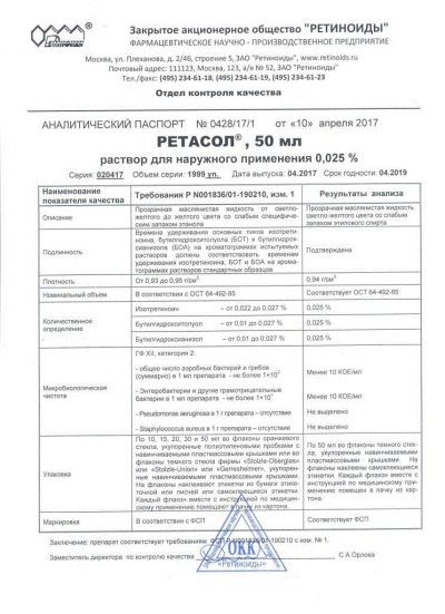 Раствор не следует назначать больным, получающим другие препараты из группы ре-гиноидов, чтобы уменьшить риск возйикновения гипервитаминоза А. Действие раствора ослабляется при одновременном назначении антибиотиков тетрациклиновой группы, а также при местном применении глюкокортикостероидов.
